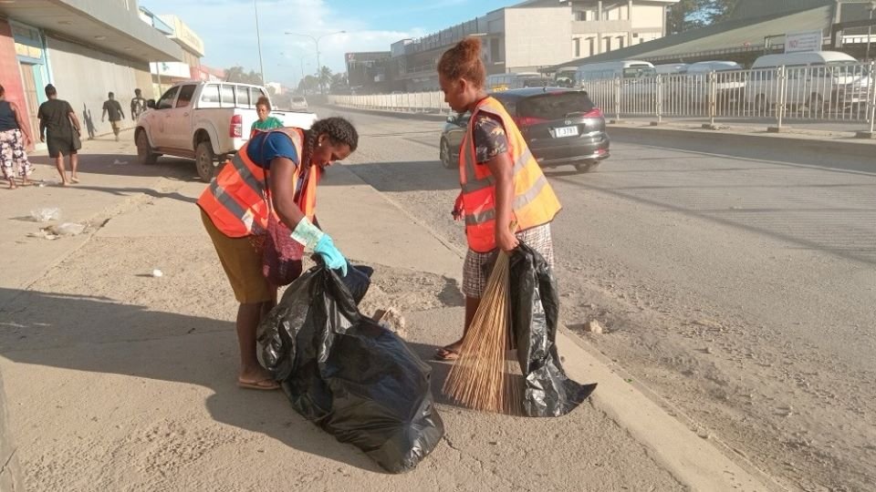 Community groups cleaning up a segment of Honiara’s main highway.