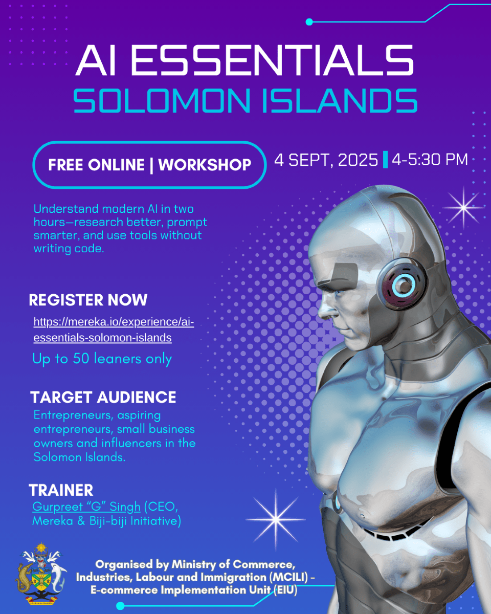 The Ministry of Commerce, Industry, Labour and Immigration (MCILI), through its E-commerce Implementation Unit (EIU), is set to deliver the first-ever AI Essentials training for entrepreneurs in the Solomon Islands.