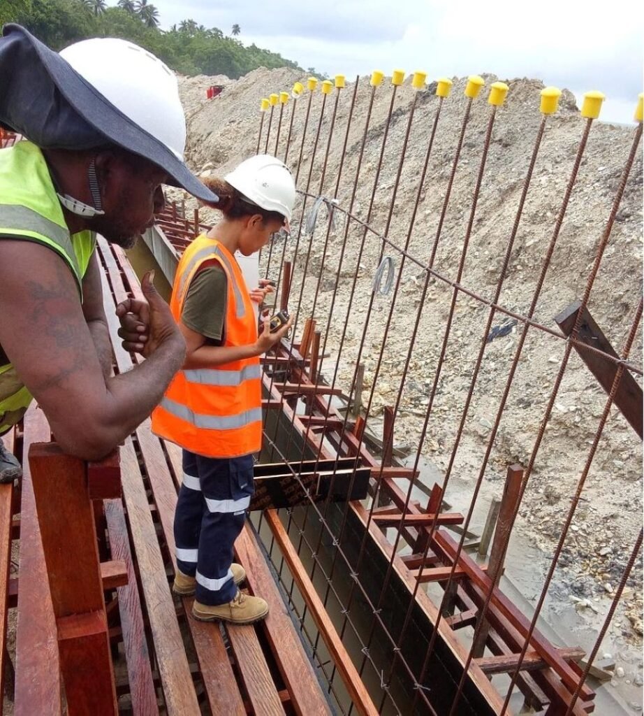 Civil Engineer Winnie Sulumae from Kramer Asia Pacific checks the quality of the seawall foundations.
