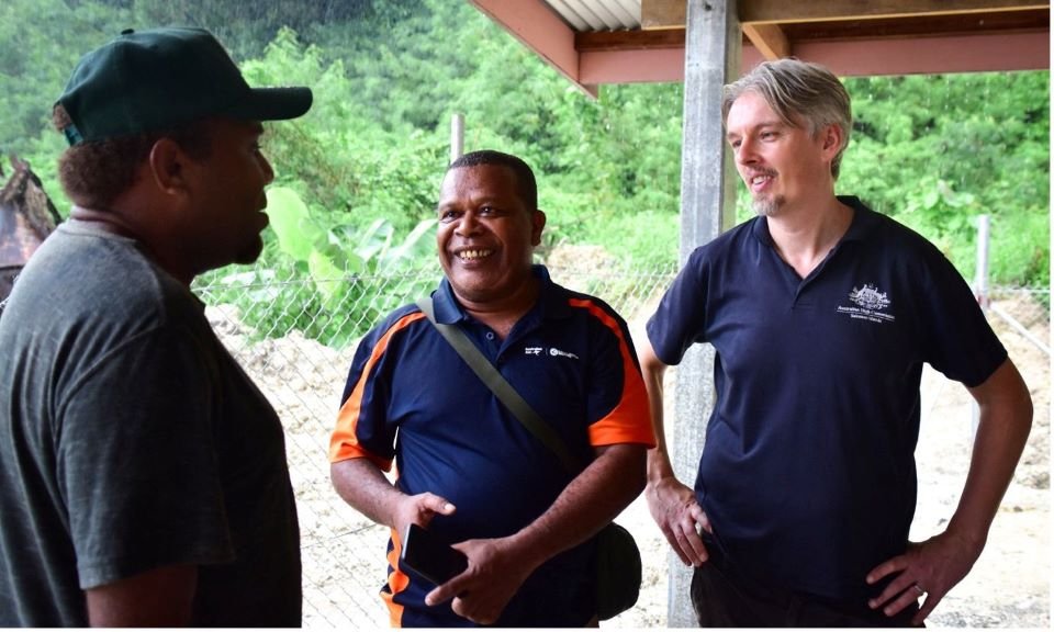 Australia is working with community to plant mangroves and coastal trees to protect the shoreline in front of the market, (from right) Australia’s First Secretary for Infrastructure, Lazar Maric, and Solomon Islands Infrastructure Program’s Hudson Kauhiona talk with Northshore Mangroves Group chairman Cameron Inomae.